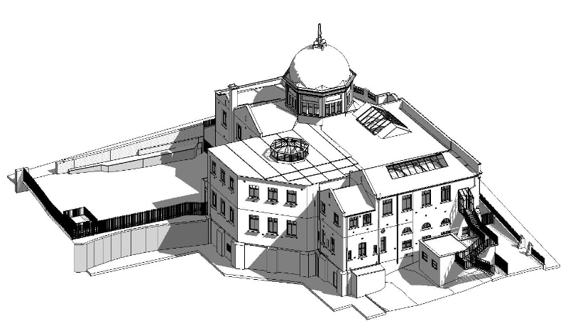 We used both ground sited and Drone laser scanning, which ties into previous existing topographical surveys. Laser Scanning offers a relatively quick and precise way to capture 3D data as a point cloud. All this data can then be used to create an accurate Building Information Model (BIM) of historic buildings such as these.